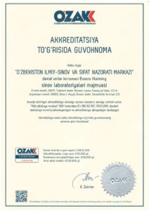 • akkreditatsiyadan o’tgan sinov laboratoriyasi;
