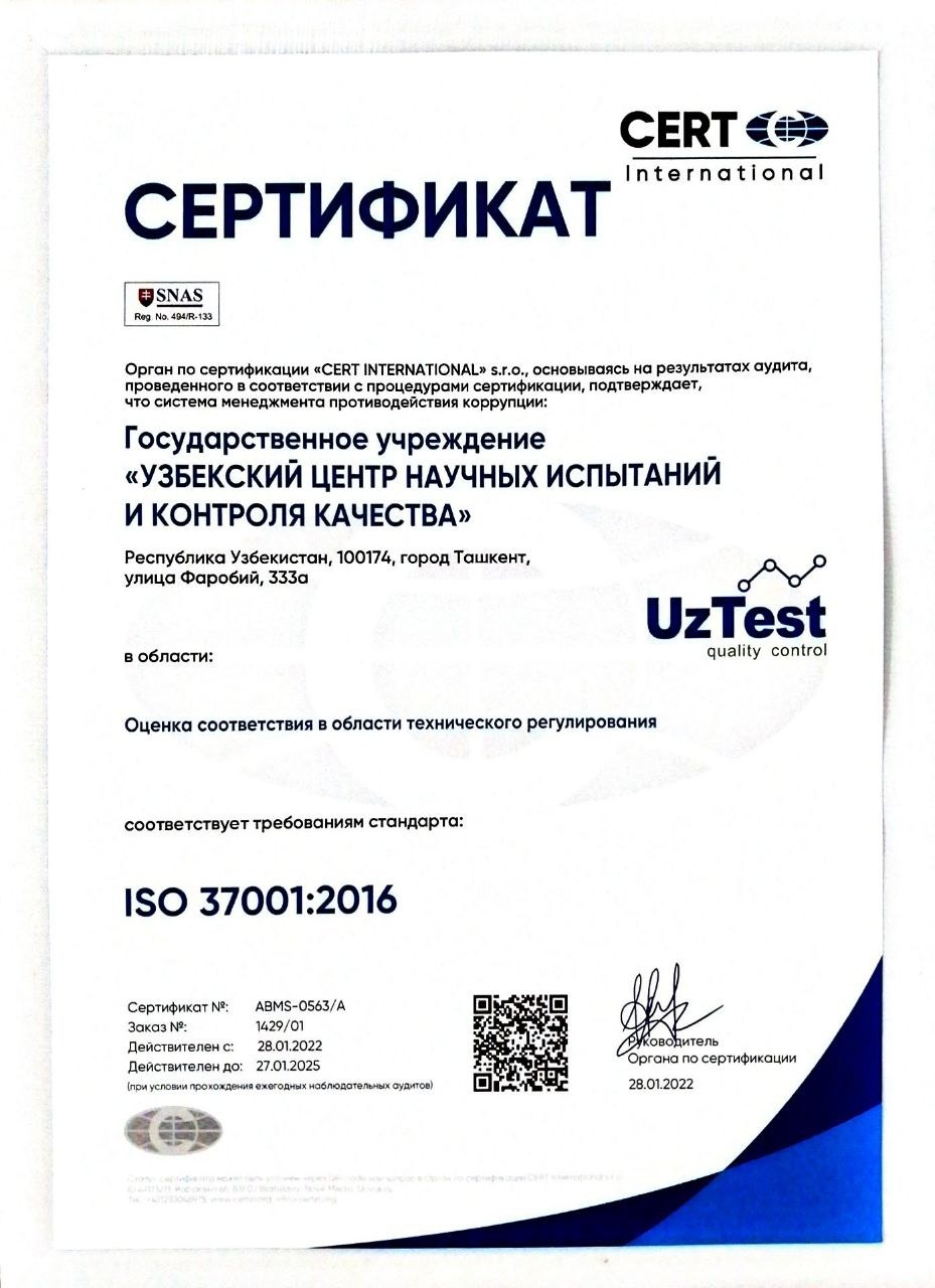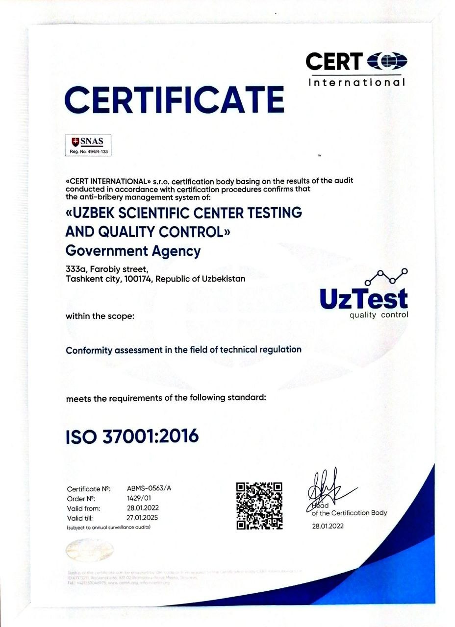 Bu borada “CERT international” masʼuliyati cheklangan jamiyati tomonidan «Oʻzbekiston ilmiy-sinov va sifat nazorati markazi» davlat muassasasida xalqaro standart ISO 37001:2016 “Korrupsiyaga qarshi kurashish (pora olish va berish bilan kurashish” menejmenti tizimi”ni ishlab chiqish, joriy etish va sertifikatlashtirishdan oʻtkazish boʻyicha dastlabki va ikkinchi bosqich audit jarayonlari oʻtkazilib, xalqaro sertifikat taqdim etildi. Unga koʻra, «UzTest» davlat muassasasi va uning hududiy filiallari korrupsiya illatidan holi hamda ushbu illatga nisbatan murosasiz munosabatda ekanligi maʼlum qilindi.