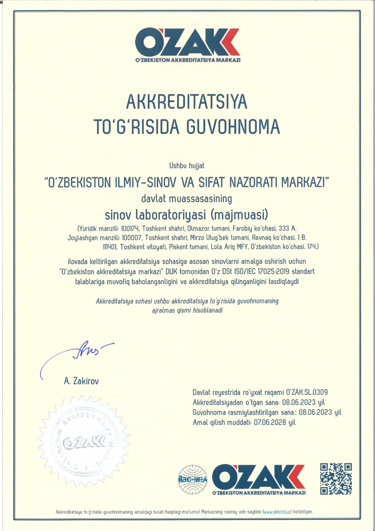 Davlat reestr raqami: O’ZAK.SL.0309