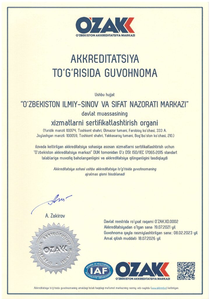Akkreditatsiya qilingan Sertifikatlashtirish organining davlat reestri